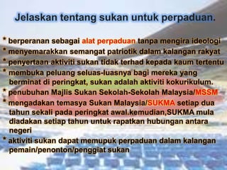 Hal ini demikian kerana kegiatan sukan dapat melahirkan. Setiap pelajar diwajibkan menyertai aktiviti sukan di sekolah. Di samping itu sukan merupakan salah satu instrumen penting untuk mengeratkan hubungan perpaduan dan integrasi masyarakat negara yang berbilang kaum.